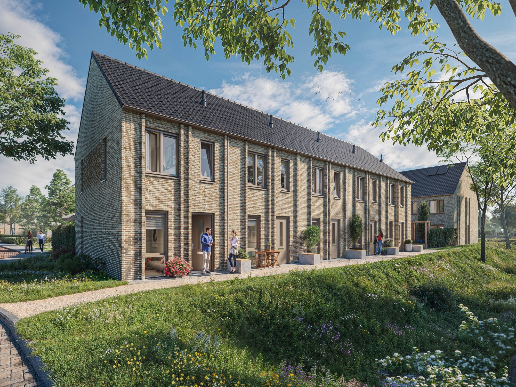 In Campus Driene bouwen we samen aan geluk. Hier hebben we aandacht voor de aarde, maatschappij, mens en continuïteit. Maar hoe doen we dat precies? Blue vertelt: ”Aan de aarde wordt gedacht door het behoud van de bomen, de flora en fauna en de wadi’s. Ook denken we aan de maatschappij door te bouwen voor een brede doelgroep. Een mix van koop en huur. We bedienen de hele markt. Zo bouwen we sociale huur, middenhuur, betaalbare koop, middeldure koop en luxe woningen. Aan de mens wordt gedacht door het creëren van verschillende hofjes waarin ontmoeten centraal staat. Tot slot hebben we aandacht voor de continuïteit door de samenwerking in dit unieke plan. De samenwerking met de gemeente en Leyten is ontzettend goed. We werken écht samen aan deze nieuwe leefomgeving. Daarnaast hebben we vanuit Trebbe een vast team. We wisten al bij de start wie onze uitvoerder ging worden. Daardoor konden we het hele uitvoeringsteam meenemen in het ontwerp en filosofie.”