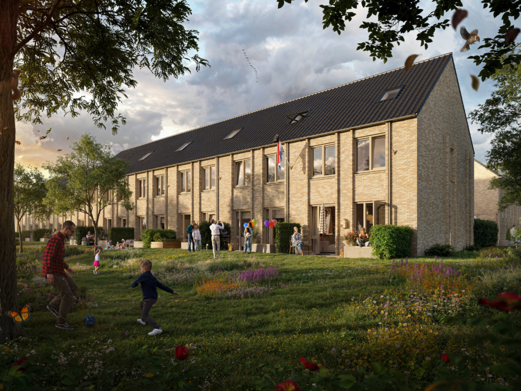 Niet alleen met het behoud van de bomen denken we aan natuurinclusiviteit en klimaatadaptiviteit. Ook sociale duurzaamheid komt terug in het plan. Zo vertelt Blue: “Bij de voorgevel plaatsen we bij elke rijwoning een bankje, zowel bij de koop- als huurwoningen. Hiermee stimuleren we ontmoeting. We hebben ook gedacht aan de dieren. Een aantal keer zijn we met de stadsecoloog op pad geweest. Hier hebben we specifiek gekeken naar het versterken van de ecologie. We kwamen erachter dat als we een aantal vleermuiskasten en broedkasten plaatsen, dit al effect zou hebben. Van de buitenkant zie je het bijna niet, maar het zit er wel. Een aantal woningen hebben een vleermuiskast. Vleermuizen zijn erg territoriaal, daarom worden er in alle windrichtingen een aantal geplaatst. Verder plaatsen we nog vogelvides op de noordgevel zodat de vogels een fijne plek hebben om te broeden.”